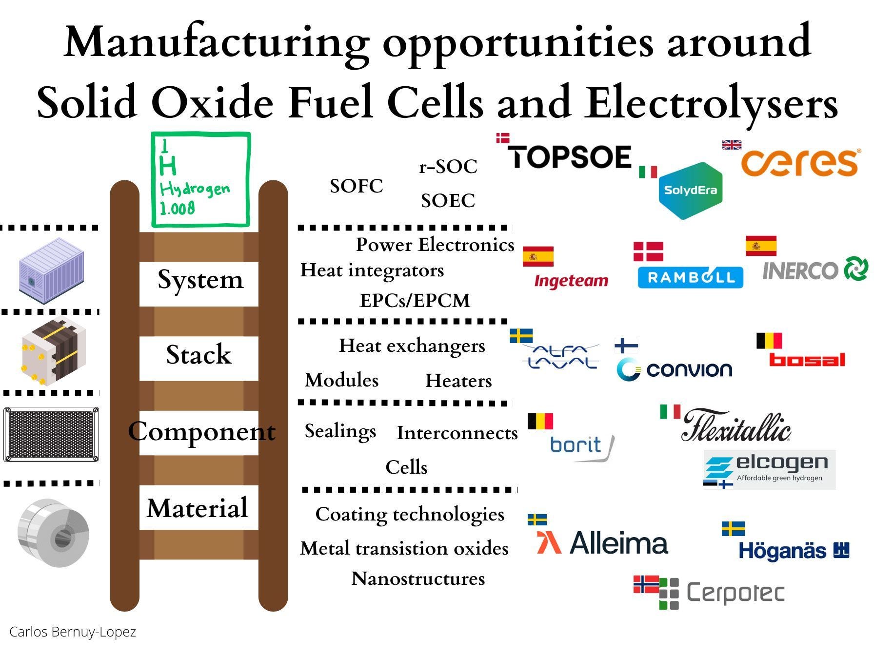 I put together the map in the image to illustrate the manufacturing opportunities around Solid Oxide Fuel Cells (SOFC) and Solid Oxide Electrolysers (SOEC), including reversible SOC (r-SOC) across four layers: materials → components → stacks → systems.